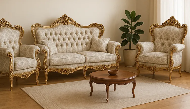 - طلایی: رنگ طلایی، به خصوص اگر با منبتکاریهای طلایی مبل هماهنگ باشد، اوج شکوه و تجمل را به نمایش میگذارد. این رنگ میتواند به تنهایی یا در ترکیب با رنگهای دیگر (مانند کرم یا زرشکی) استفاده شود.