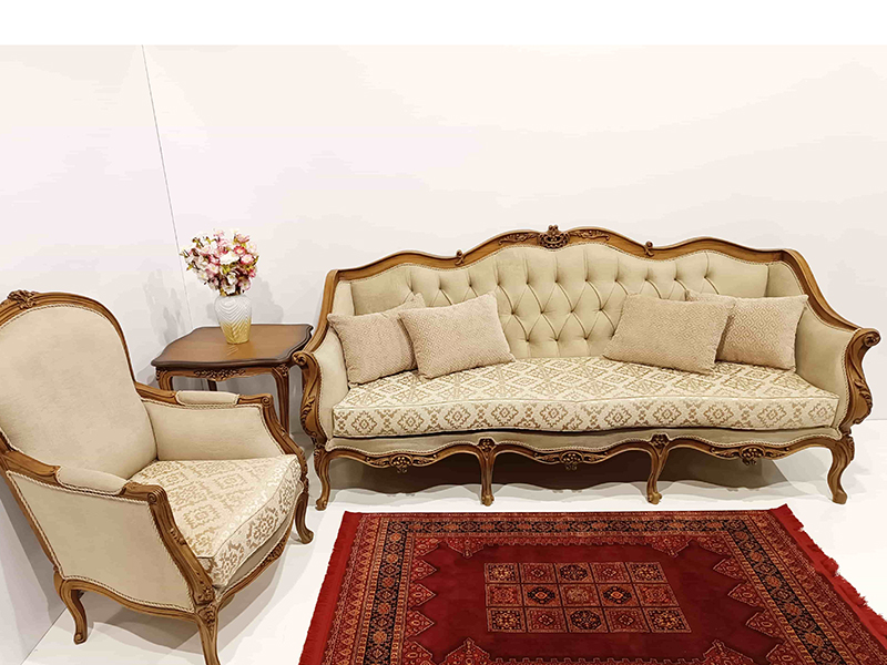 رنگ پارچه مبل سلطنتی باید با چوب منبتکاریشده آن هماهنگی کامل داشته باشد. اگر چوب مبل طلایی یا سفید است، رنگهای ملایمتر مانند کرم، بژ، آبی روشن یا حتی پاستلی، جلوهای باز و دلنشین ایجاد میکنند و به برجستهسازی جزئیات منبت کمک میکنند. این ترکیب باعث میشود فضا بزرگتر و روشنتر به نظر برسد. در مقابل، اگر چوب مبل قهوهای تیره، گردویی یا ماهگونی است، رنگهای پارچه روشنتر مانند کرم، طلایی، استخوانی یا حتی نقرهای میتوانند کنتراست زیبایی ایجاد کرده و باعث شوند مبل بیشتر جلوه کند.
