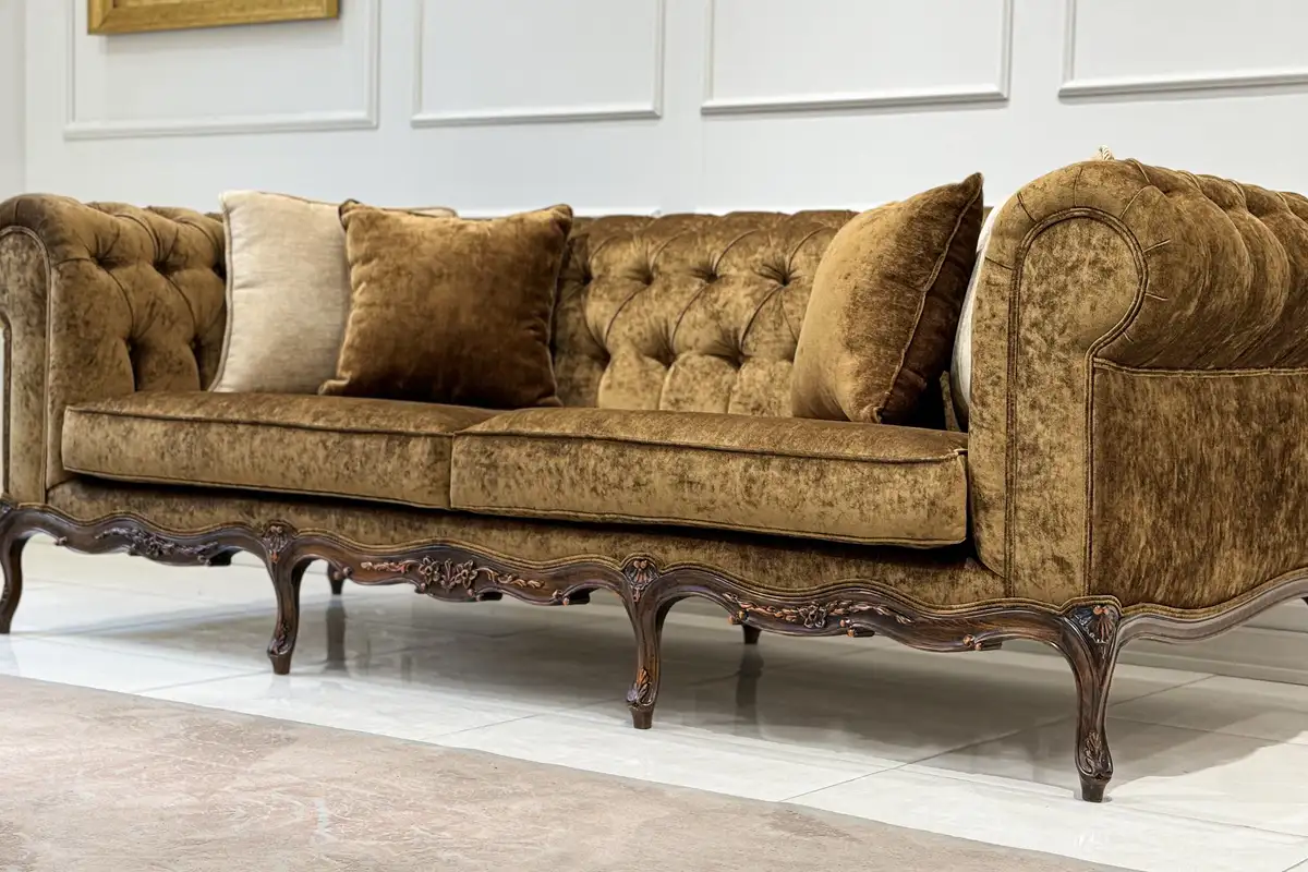 - دکمهدوزی عمیق (لمسهکاری): بارزترین ویژگی چستر، دکمهدوزیهای فرو رفته و منظم روی پشتی، دستهها و گاهی نشیمن آن است که جلوهای سهبعدی و لوکس ایجاد میکند.