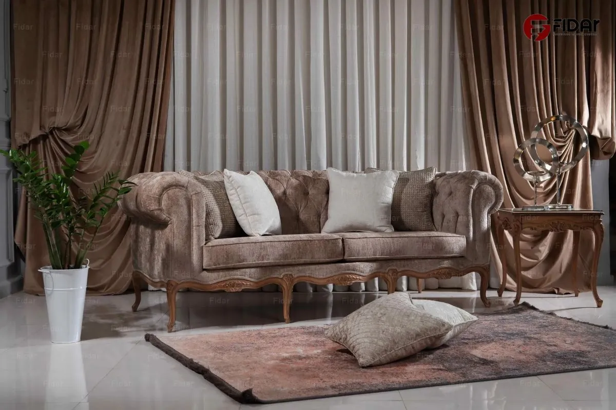 - روکش پارچه یا چرم: در مورد مبل چستر، چرم طبیعی باکیفیت و برای مبل کلاسیک، پارچههای بافتدار و مقاوم در برابر سایش (مانند مخمل باکیفیت یا ژاکارد) را انتخاب کنید. اطمینان حاصل کنید که پارچه یا چرم به خوبی کشیده شده و بدون چینوچروک یا شلشدگی باشد.